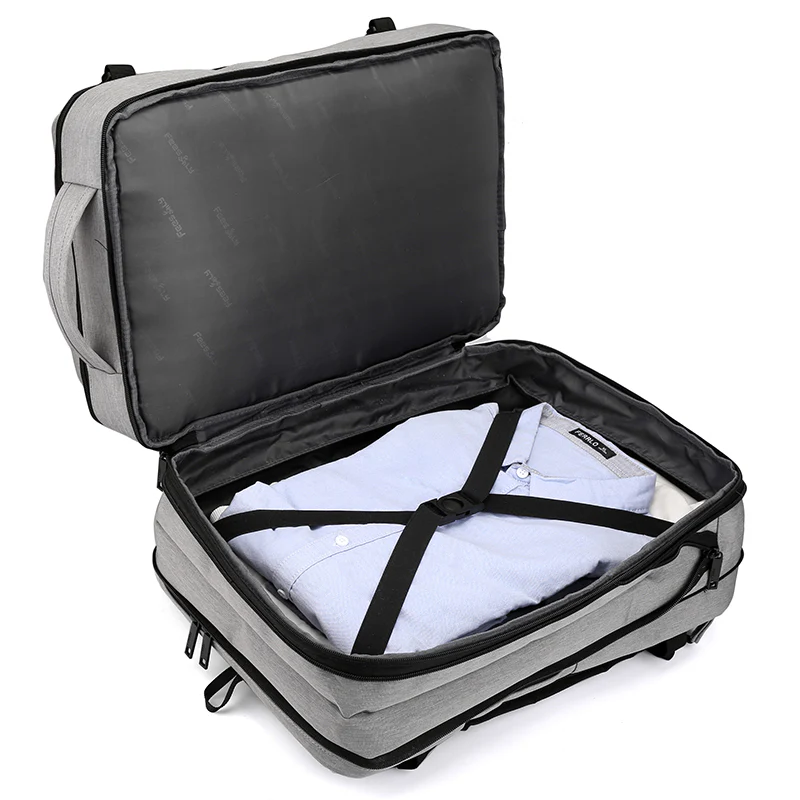 The Voyager Ultra Fit Plus is designed for travel efficiency — featuring compression straps to reduce bulk, dual front compartments for easy access, and a luggage strap to slide it over your suitcase handle.